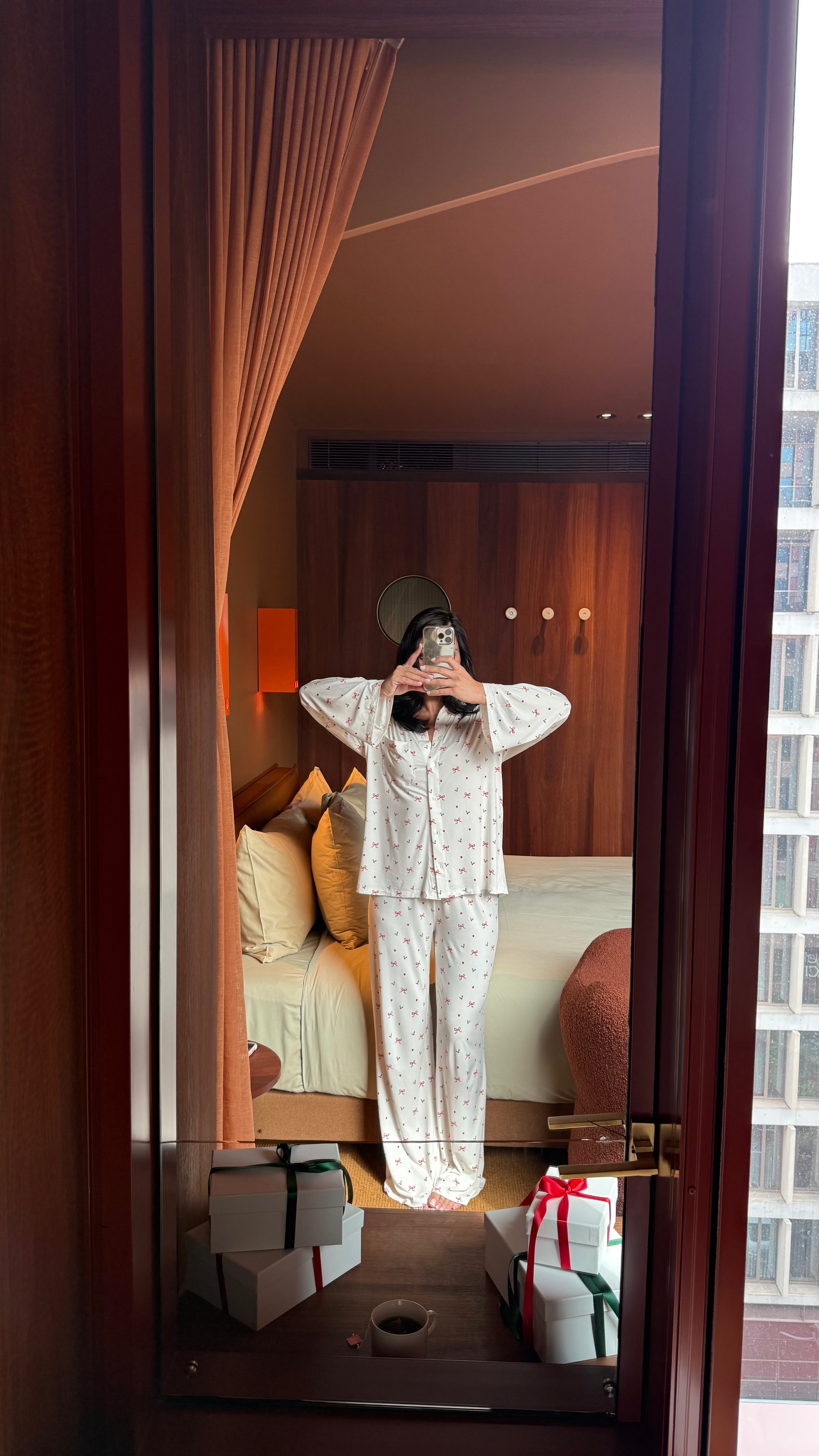 Fabric: Crafted from 95% bamboo viscose and 5% spandex, this fabric is incredibly soft, breathable, and has just the right amount of stretch for a perfect fit that moves with you. The bamboo adds a touch of luxury, while the spandex ensures a comfortable and flexible fit, making it the world's best pj!