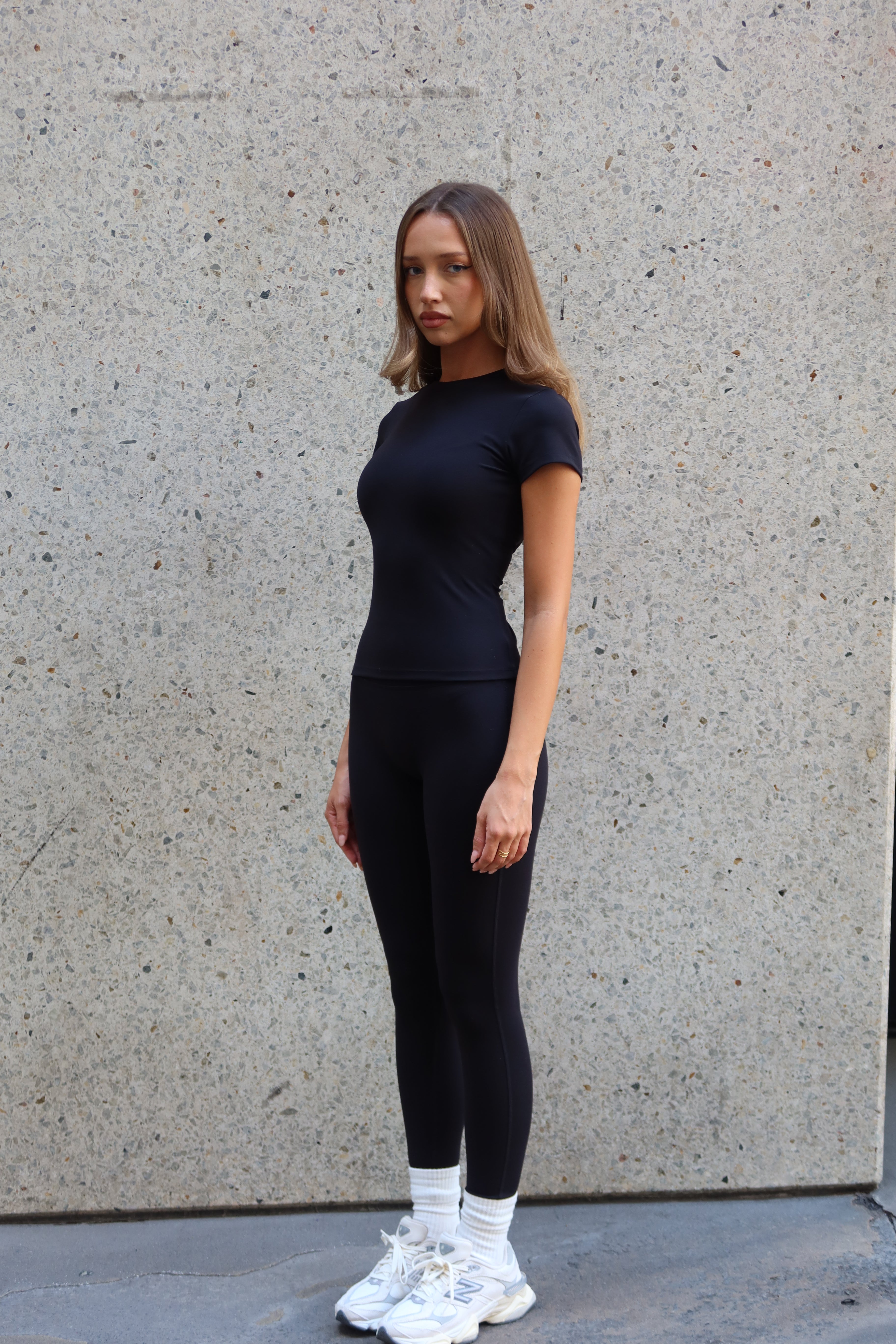 The perfect tee, elevated. The Elloré Sport Basic T-Shirt is a refined, body-hugging essential designed to bring softness, structure and ease into your everyday uniform. Crafted from our Soft-Touch Performance fabric, it offers a smooth, sculpting feel that moves with you - breathable enough for Pilates, polished enough for the airport and effortless for everything in between.